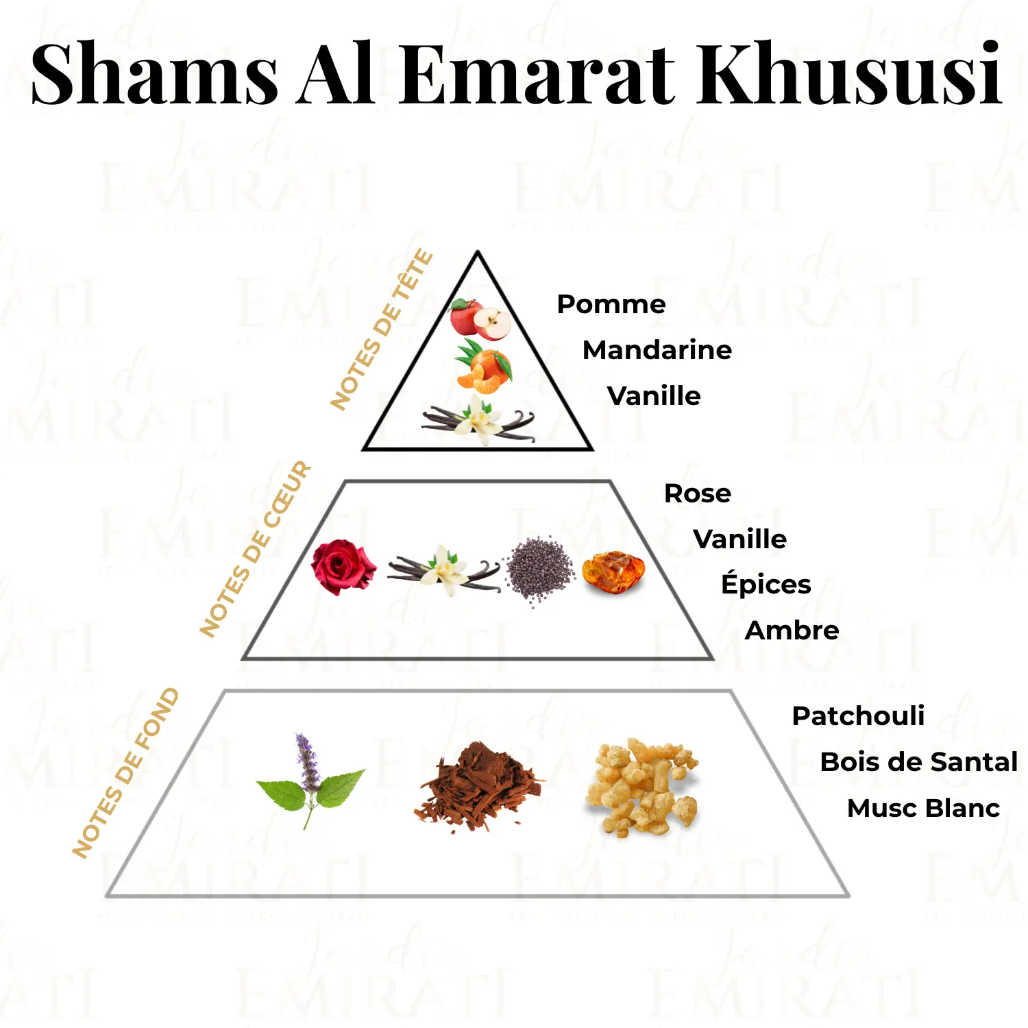 Succombez à la chaleur orientale de Shams Al Emarat Khususi, un parfum unisexe de Al Zaafaran enveloppant et sensuel qui allie la douceur fruitée de la pomme et de la mandarine à une vanille délicieusement gourmande. En cœur, la rose, l’ambre et les épices se mêlent pour offrir une signature olfactive chaleureuse et envoûtante. Le fond boisé et musqué, soutenu par le patchouli et le bois de santal, laisse un sillage profond et sophistiqué. Une fragrance mixte iconique, à la fois douce et puissante, idéale pour celles et ceux qui aiment les parfums orientaux riches et durables.